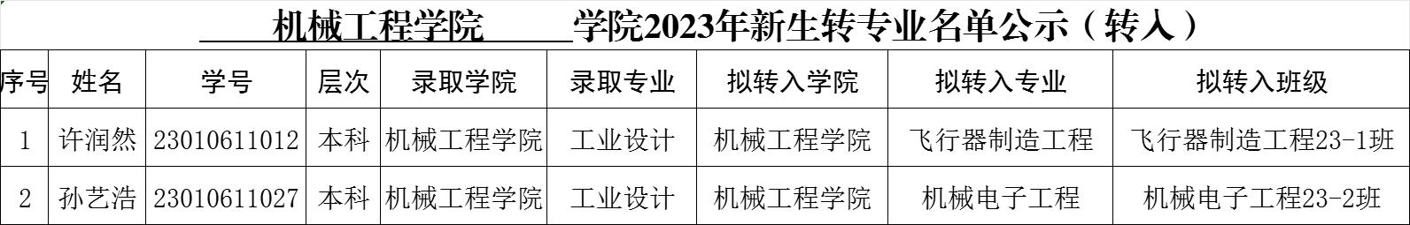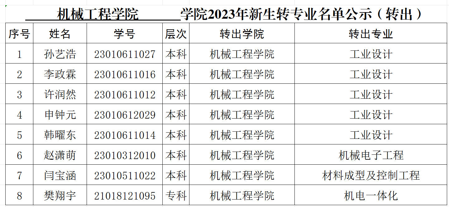根据《yl7703永利集团学生转专业管理办法》,经个人申请,学院审议,机械工程学院拟同意转出8人,转入2人,现对转专业学生进行公示,公示期2023年12月11日至2023年12月13日,公示期间如有疑议,请到机械工程学院321办公室反映,联系方式2909844。