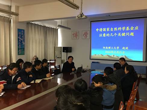 然后,赵波教授阐述了基金申报前应注意的几个问题,包括:1、关注当年国家基金委的年度目标与资助方向。2、关注上一年国家基金资助的总体情况。3、总结上一年自然科学基金资助项目的特点。4、对上一年河南省高校获基金进行统计并对我校基金申请现状展开分析,通过基金申请现状分析,肯定自己的进步,同时也正视自己的不足与差距。5、自然基金同行评议要点分析。6、分析不予立项的原因,避免基金本子出现低级错误。7、摆正基金申请的指导思想:要注重持续积累,不怕失败,提前准备等。8.申请书中的几个关键点,其中着重强调了项目的创新性,同时通过举例对如何选题展开了深入交流与探讨。