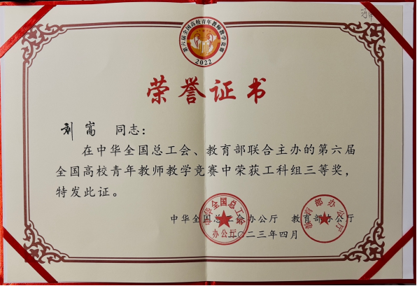 2023年4月21日至24日,第六届全国高校青年教师教学竞赛决赛在清华大学举办。大赛由中华全国总工会、教育部联合主办,中国教科文卫体工会、教育部教师工作司承办,北京市教育工会、清华大学协办。我青年教师刘嵩代表河南省(唯一)参加工科组决赛,荣获工科组等奖,这是我校首次参加此项比赛的全国决赛,实现了学校在此项教学竞赛中获奖零的突破