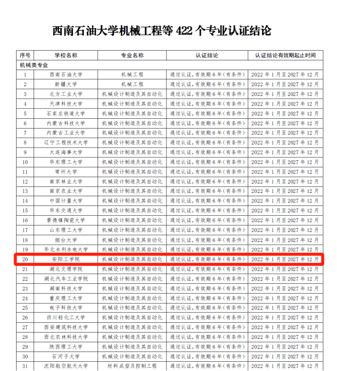 6月25日,中国工程教育专业认证协会发布公示,我校机械设计制造及其自动化专业(简称机制专业)通过了工程教育专业认证,有效期为6年。机械设计制造及其自动化专业是我校第一个通过工程教育认证的专业,对我校今后的发展意义重大,它标志着学校高质量推进专业内涵建设进入了新阶段。此次认证通过,标志着机械设计制造及其自动化专业的人才培养质量已达到国际实质等效的工程教育标准及要求,为该专业学生走向世界提供了具有国际互认质量标准的“通行证”。工程教育认证是我国高等学校推进工程教育改革的重要举措,是教育部提出具有中国特色“五位一体”评估体系的重要组成部分,是实现工程教育国际化的重要标志,是大力推进“新工科”建设的重要抓手,也是学校提升专业内涵,提高人才培养质量的重要举措。